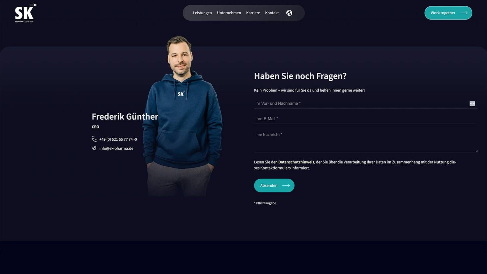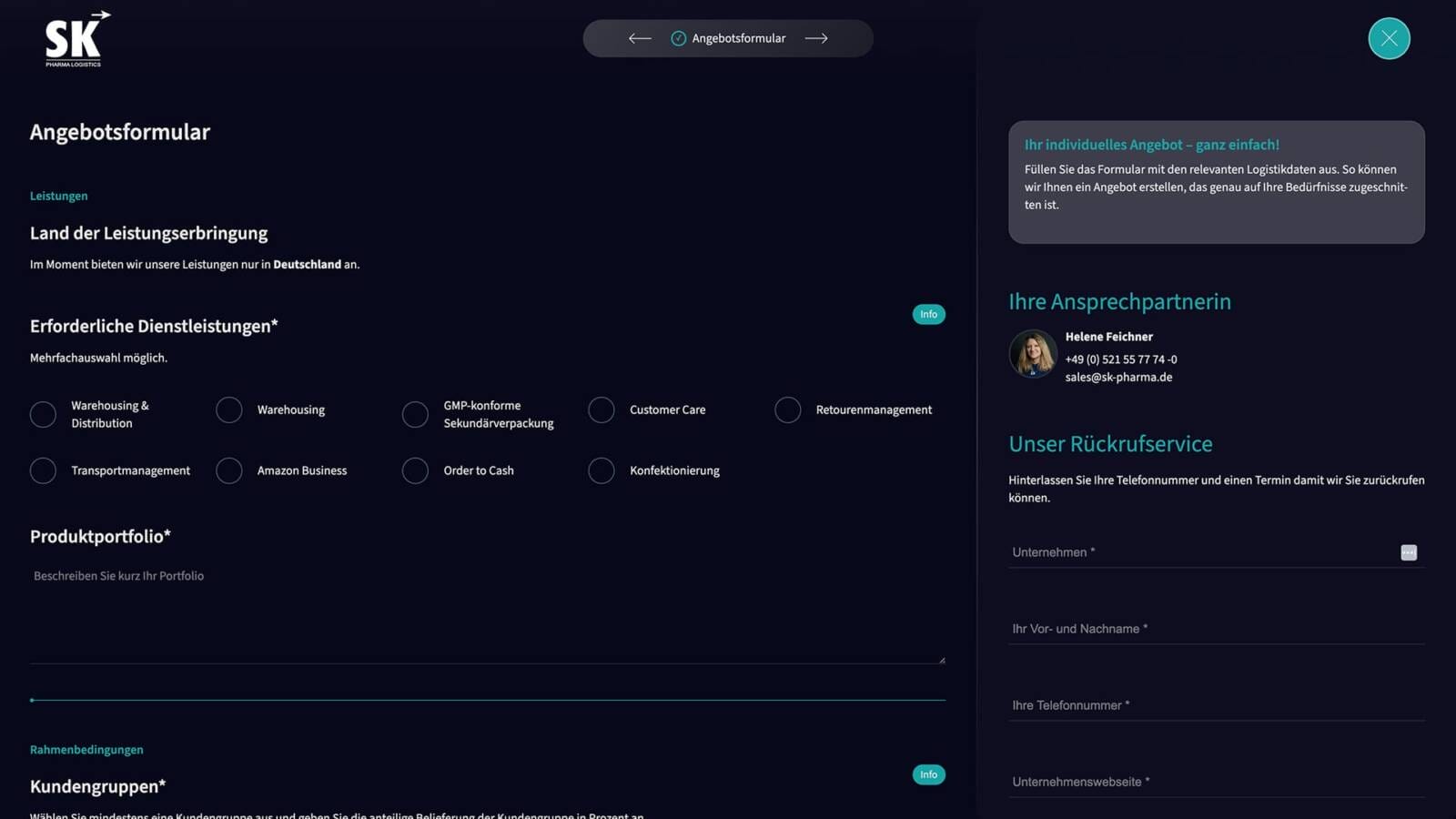 Die Website macht es leicht, Kontakt aufzunehmen. Wer direkt loslegen will, kommt in wenigen Klicks zu einem individuellen Angebot. Wer sich erst informieren möchte, bekommt einen echten Einblick in die Prozesse und Services im Bereich Healthcare Logistics.